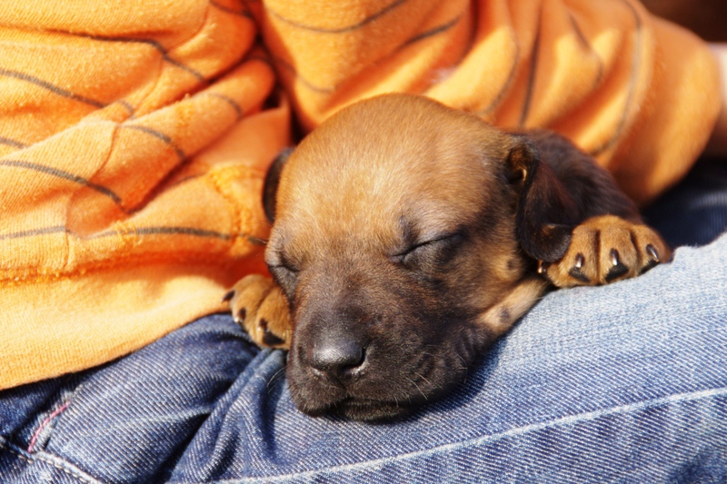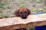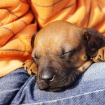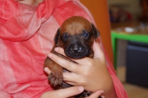 Das ist der Barnabas. Er wurde als dreizehntes geboren und wog 360 g. Er hat mit 12 Tagen die Augen geöffnet und trägt kein Halsband, da er anfangs der Kleinste war und durch das markante Abzeichen gut zu erkennen ist. Barnabas ist der kleine Liebling der Kinder geblieben, da er total lieb ist und sehr anhänglich durch die extra Behandlungen .