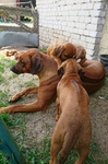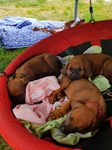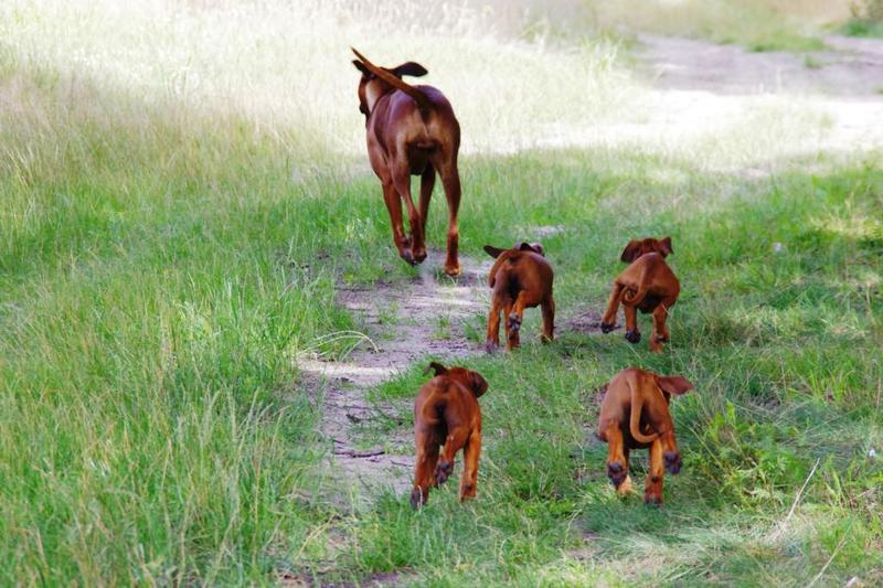 Das Warten hat ein schönes Ende ! Am 29.05. 2018 hat Aminata 6 wunderschönen Ridgebackbabies das Leben geschenkt. Es ist ein sehr ausgeglichener Wurf- 3 Rüden und 3 Hündinnen, alle mit etwas Abzeichen und sehr kräftigem Pigment und etwa gleich groß und schwer. Alle sind schon total verliebt in die kleinen Ridgeträger - am meisten natürlich Aminata, die ihre Sache wieder mustergültig macht. Da es ja eine Wiederholungsverpaarung des C- Wurfes ist, können wir uns schon sehr gut vorstellen, wie die kleine Bande in ein paar Wochen aussieht, wenn sie draußen herumflitzt.