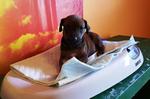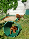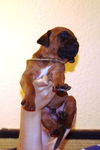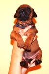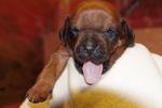 Das ist der Barnie. Er ist als erstes geboren und wog bei der Geburt 355 g. Er hat nach 11Tagen die Augen geöffnet und trägt nun ein oranges Halsband. Barnie ist einer von den ruhigeren Jungs, der gern nach dem Spielen ausgiebig schläft. Er war bei allen Fototerminen, Zuchtwart-und Tierarztuntersuchungen stets brav und Geschirr und Leine sind gar kein Problem.